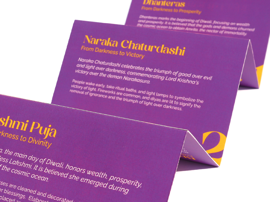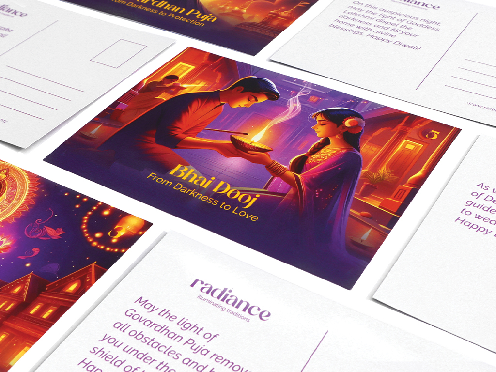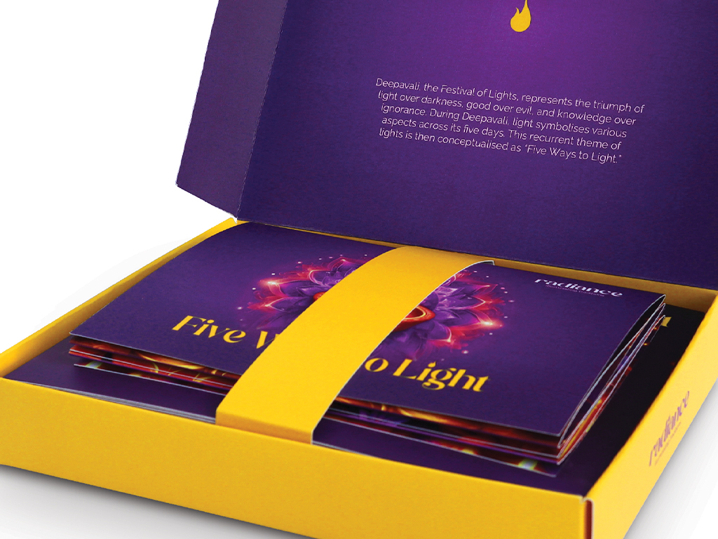 Each item in the kit will consist of a set that corresponds to the specific days, and their significance. The Deepavali Festival Kit embodies these principles through symbolic artworks on post cards, a narrative brochure depicting a journey from darkness to light, a box of matches and a diya lamp. It celebrates cultural richness and engages emotions, ensuring a memorable and meaningful celebration for recipients.