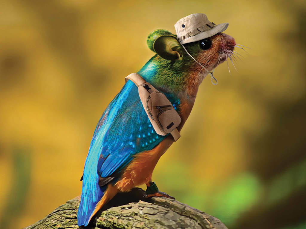 In this playful photo manipulation, I merged the features of a mouse and a kingfisher to create a whimsical new character. With a mouse’s face on a kingfisher’s body, completed with an adventure hat and sling bag, this surreal image is designed to be cute, charming and imaginative.