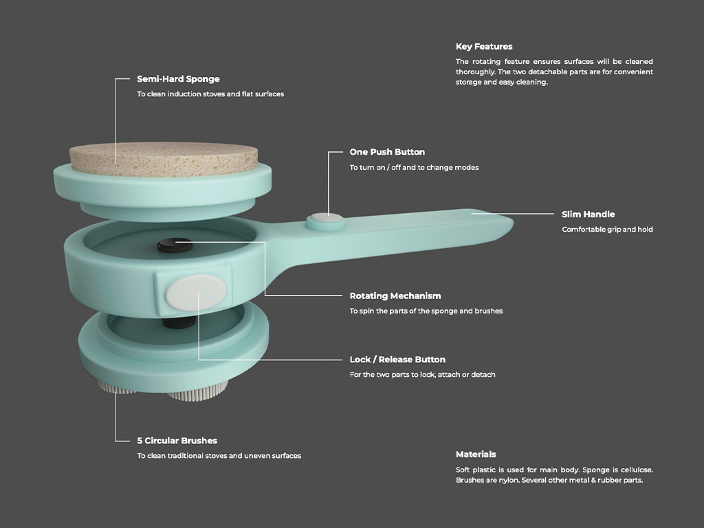 Stovensil is a kitchen cleaning brush tool that can scrub, brush and clean either induction stoves or traditional stoves. It aims to make cleaning easier by needing to use less strength. Designed especially for disabled housewives with cerebral palsy symptoms such as: poor coordination, stiff muscles, tremors, etc. With Stovensil, these housewives will never have to overwork their hands.