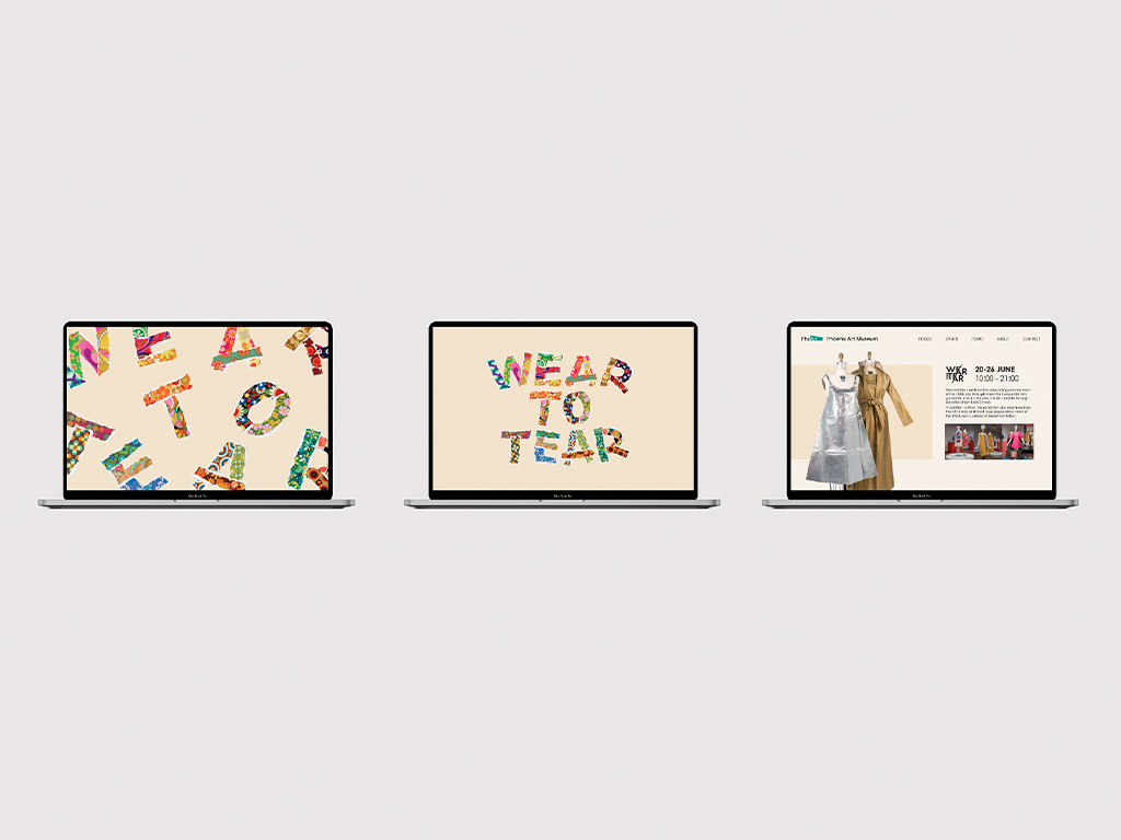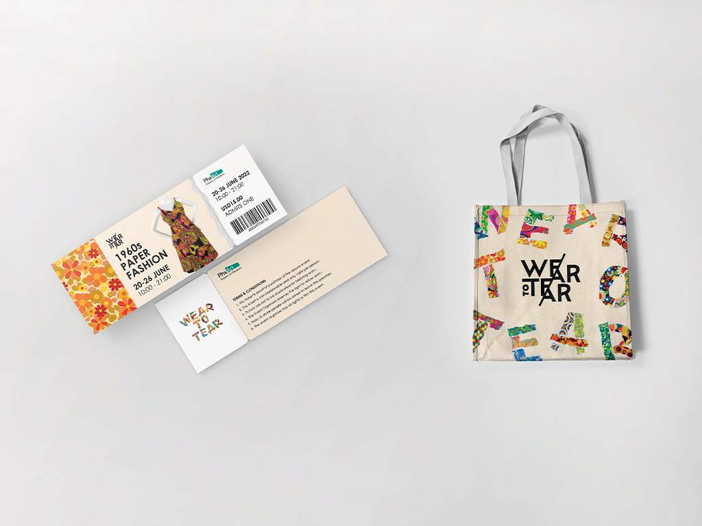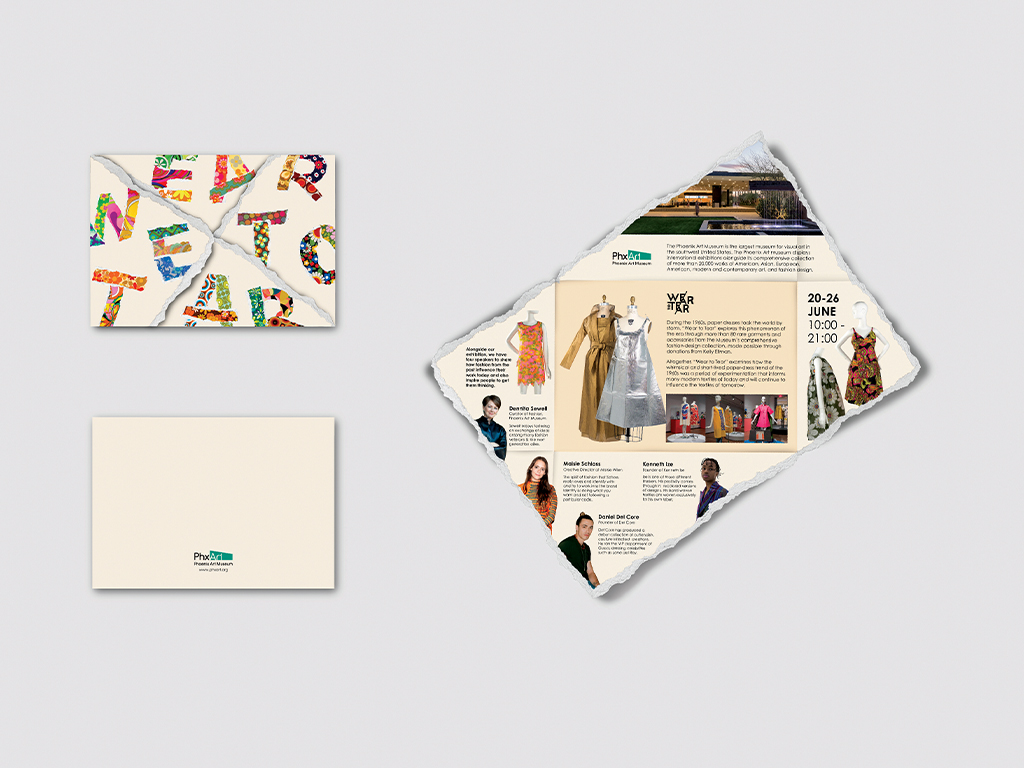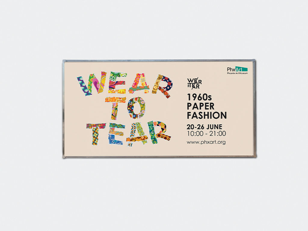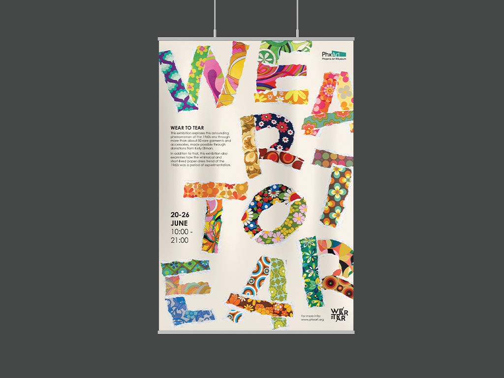 For this conceptual project, I reimagined the identity of an existing exhibition by the Phoenix Art Museum. Drawing inspiration from the playful and experimental spirit of 1960s paper fashion, the design explores how this whimsical trend shaped modern textiles. The key visual is built around the title “WEAR TO TEAR,” with each letter featuring different textile paper designs and torn edges, symbolising the temporary and bold nature of paper garments from the era.